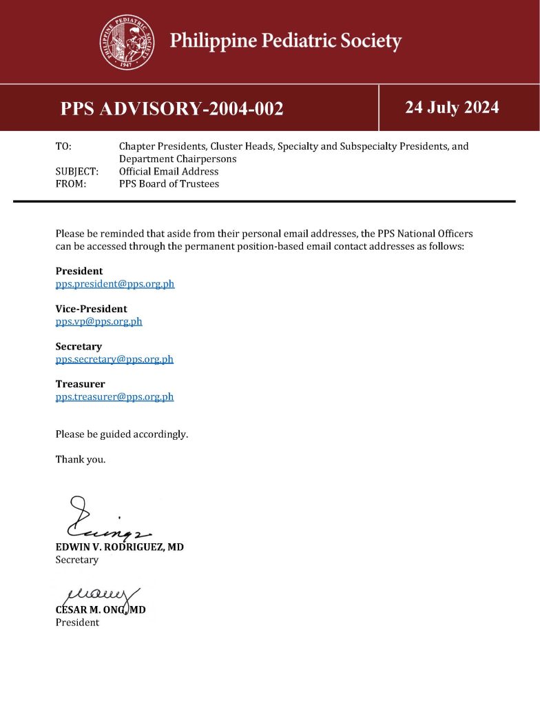 - The Philippine Pediatric Society will never request payments in foreign currency or sensitive information via email without prior official notice through verified channels.